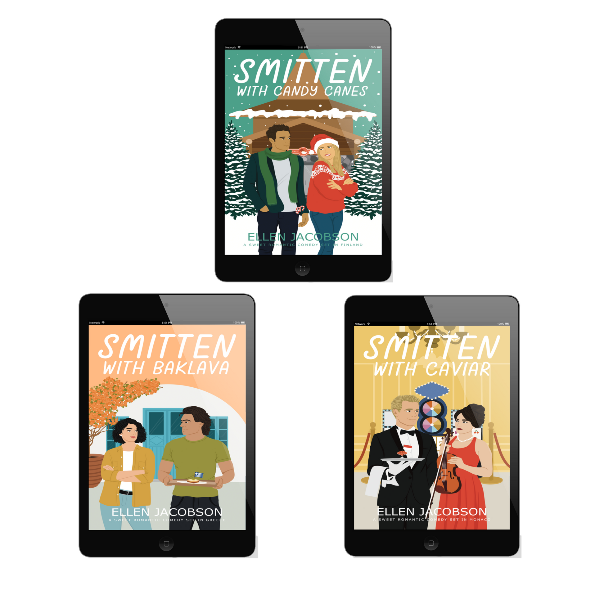 Romantic comedy ebook bundle including Smitten with Candy Canes, Smitten with Baklava, and Smitten with Caviar. Three women traveling the world who find love when they least expect it. Hilarious humor. Happily ever afters. Lots of laughs. All the feels.